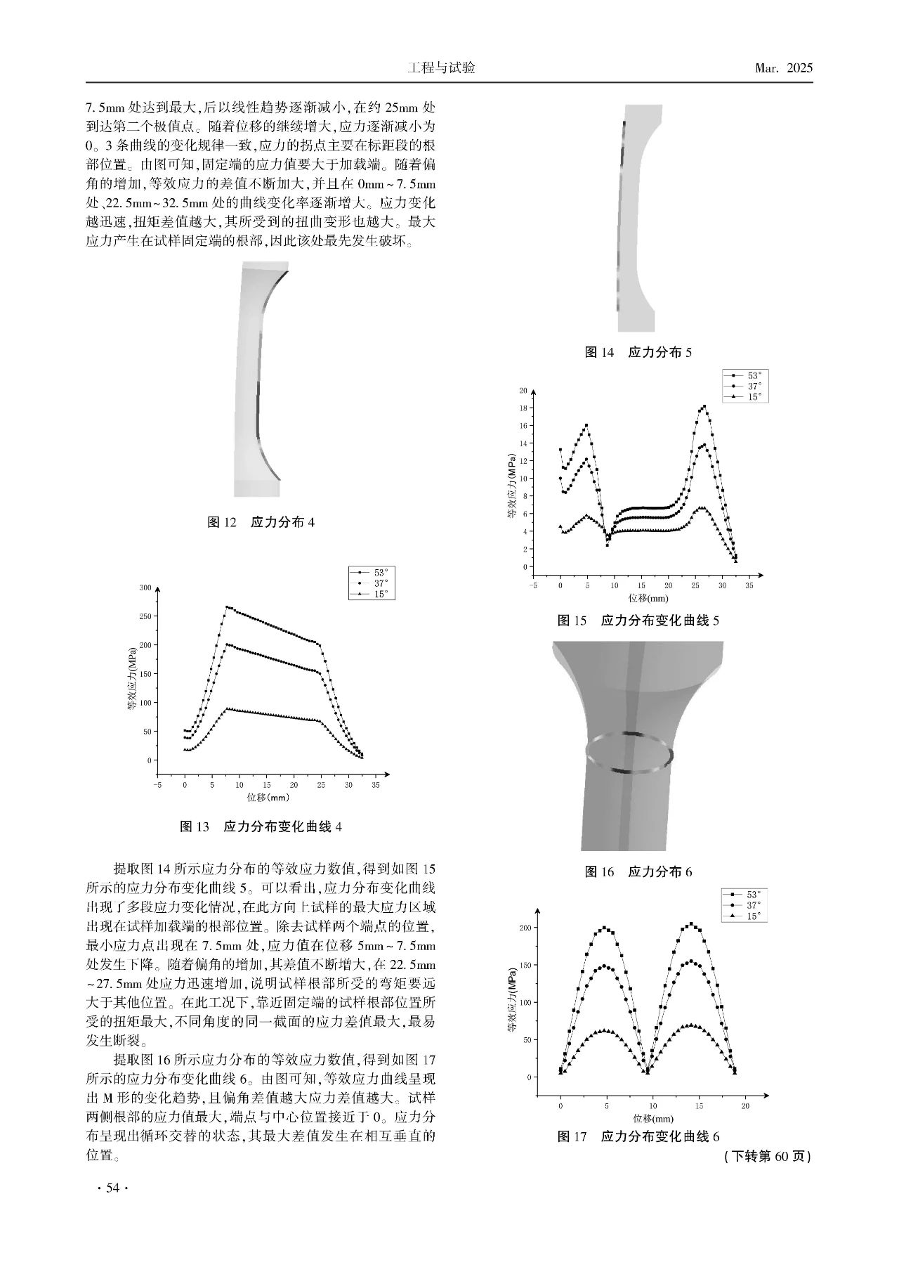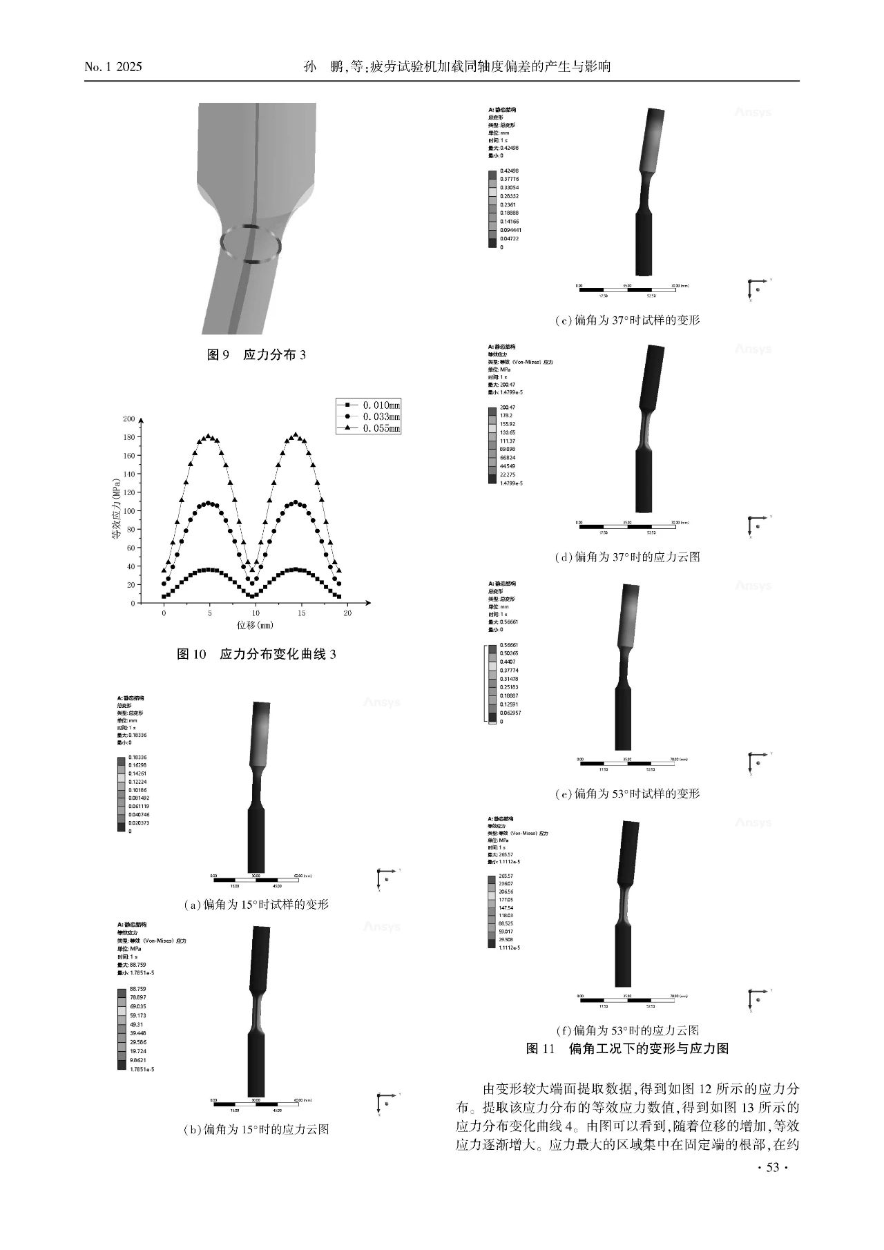 同軸度對疲勞試驗機的影響極為顯著。本文基于有限元仿真理論,分析在非共線與偏角工況下試樣變形與應力變化規律。研究發現,在非共線工況下,試樣出現橫向擠壓現象,試樣會向著某個方向發生剪切變形,形成類似于S形的變形,試樣表面變形較大一面的應力分布呈現明顯的M形,與該應力分布呈面垂直的應力分布呈現扁平的M狀態,應力劇烈變化段與最大差值部分集中在試樣的根部位置,且隨著偏置間距的增加,應力差值與曲線斜率逐漸增大。在偏角工況下,偏角的存在使得加載力可分解為水平與垂直方向的分力,試樣呈現出C形的變形,沿試樣表面變形較大一面的應力出現兩個拐點,隨著角度增大而差值增大,與該應力分布呈面垂直的應力分布在試樣標距兩端的根部出現拐點,且靠近固定端根部的位置應力差值最大,最容易發生斷裂。在這兩種工況下,截面應力均呈現循環分布的狀態。